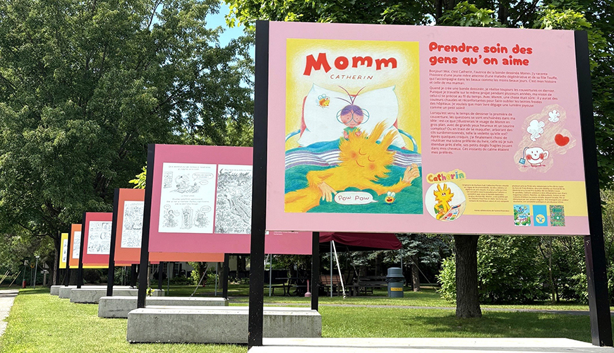 Jusqu’au mois de juillet 2026, la touchante exposition « Prendre soin des gens qu’on aime », tirée de la bande dessinée « Momm » de l’autrice et illustratrice Catherine Plante, est présentée sur le terrain du CHSLD Frederick-George-Heriot (du côté de la rue Brock).